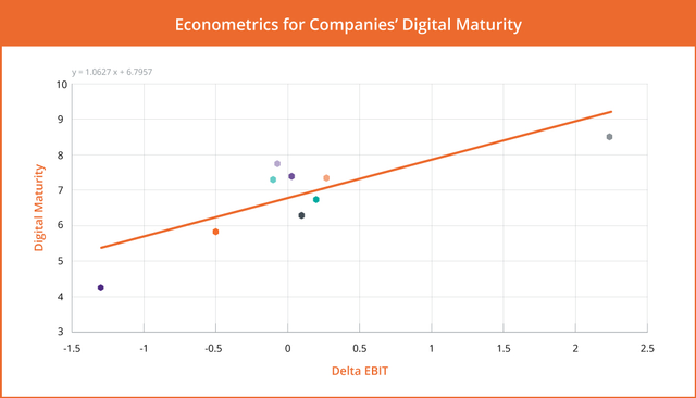 After grading and weighting these categories, I scored an assessment against their company’s digital maturity level, and charted this alongside earnings before interest and taxes (EBIT). View more on the methodology here.