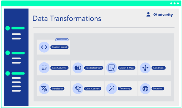 Adverity provides a sophisticated fully integrated data platform with not only a wider collection of data connectors but also a range of prebuilt data transformation options without the need to code. Our Transformation copilot can provide AI assistance for powerful and multi-tiered data transformations. Lastly, you can centrally govern your data in-platform so that it is clean, secure, and valid.