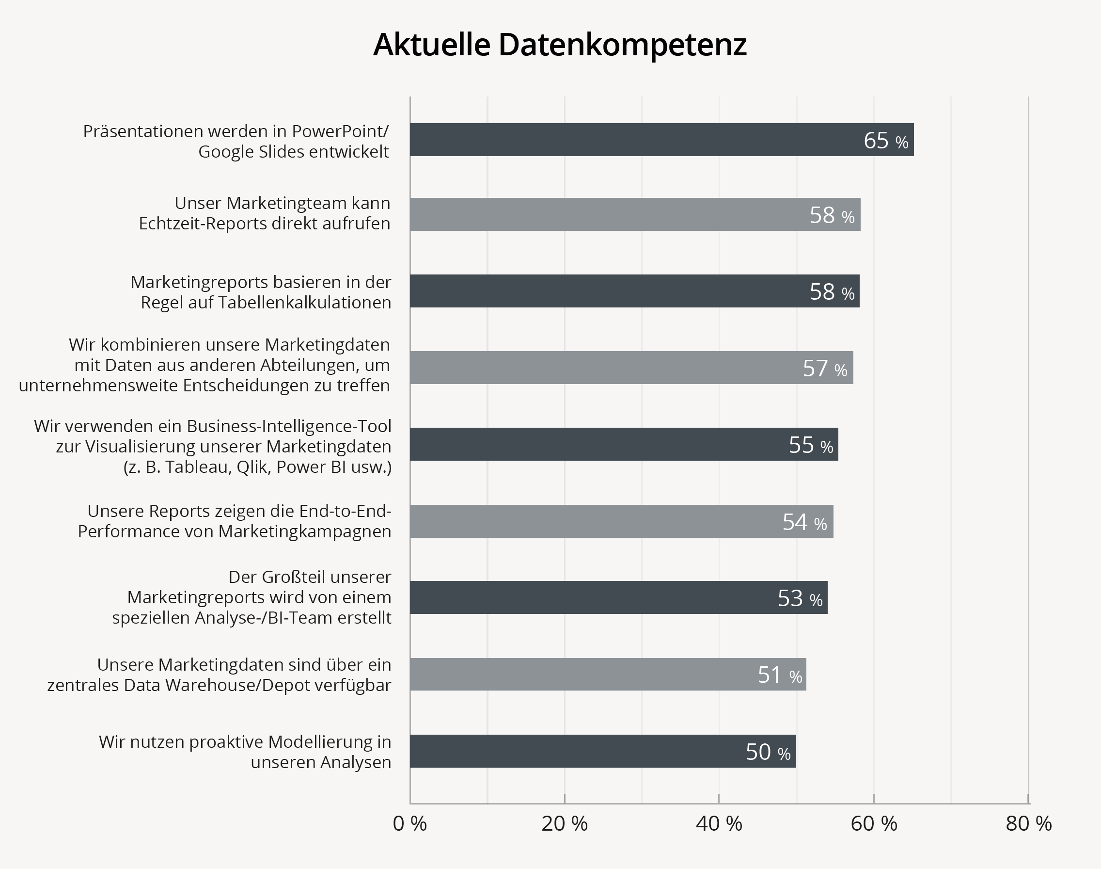 So geben beispielsweise 68 % der Befragten, die sich als analytisch ausgereift bezeichnen, an, dass ihre Marketingreports in der Regel auf Tabellenkalkulationen basieren. Ebenso geben 77 % der Befragten, die sich als analytisch ausgereift bezeichnen, an, dass sie bisher noch keinen einheitlichen Überblick über die Marketingperformance haben. Im Hinblick auf Daten und Analysen leben Marketingteams in der Vergangenheit.